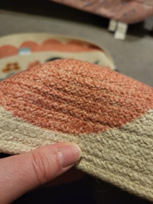 Colorful rug to add a splash of color to any room. Could also flip it over for a natural color but would give any color to the room. Not a cushy or plush rug. There is no tag on the rug so unsure of the material or care instructions.