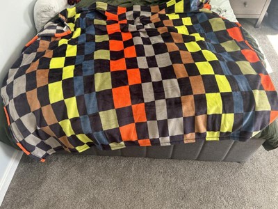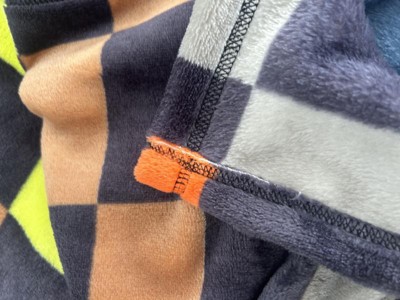 Super soft light to medium fleece blanket. Perfect size for a kid in bed or for an adult lounging on the couch. Good quality stitching especially around the corners which I appreciate. The pattern is good, leans toward masculine, gives me Minecraft or Lego vibes with its squares.