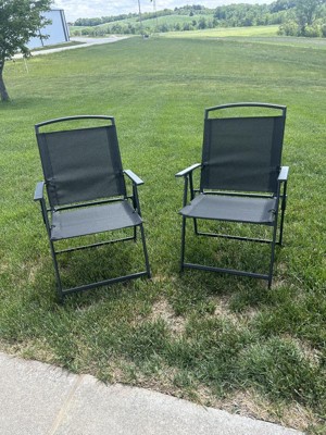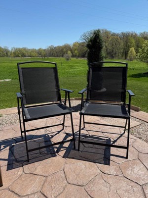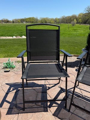 I'm impressed with the quality of these patio chairs. The steel frame makes them durable, although it took a little more effort than I expected to unfold them. They're what I'd describe as medium weight which is perfect since it can get extremely windy where we live. The black color looks sleek against the neutral tone of our patio. The seat is supportive and the back material has a slight "give" to it adding to the overall comfort. While they're touted as being weather resistant, we prefer to bring them inside when not in use.