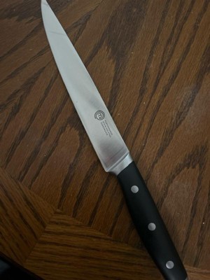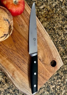 [This review was collected as part of a promotion.] Very nice premium knife, very sharp. Its cool that it’s from the master class show! It’s a little bigger than I thought it would be. The handle is very durable. I will definitely use it to carve the turkey. My first kitchen item to review thanks so much for letting me test this for my honest opinion. I love to cook!