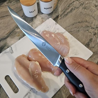 [This review was collected as part of a promotion.] I love this knife! It truly slices like a dream. From slicing a tomatoe, to cutting through partially defrosted chicken. I am going to have to purchase the entire set! I am definitely keeping this guy out of the dishwasher to preserve its perfect condition. Highly recommend!