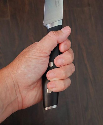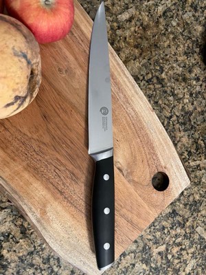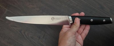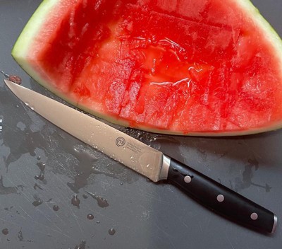 [This review was collected as part of a promotion.] This knife is amazing it’s sharp cut right through my watermelon with ease , it’s comfortable to hold very durable and the precision is spot on it came with a little cover for the tip and is safe !! Love this knife could use a whole set !!