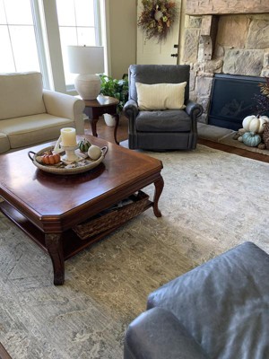 I LOVE this rug! It goes great with my off white (Oatmeal) sectional and picks up the greys and browns in our stone fireplace. My favorite accent color is blue, and that’s in there too. It’s very soft to the touch and the colors are very muted. One of my best purchases ever!