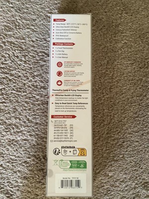 Great thermometer for making candy and frying up food. Clear display and instructions which makes reading the temp easy. Good little clip on pot holder too. Works great and makes cooking candy almost more simple taking the guess work out of things! Comes with a battery too.