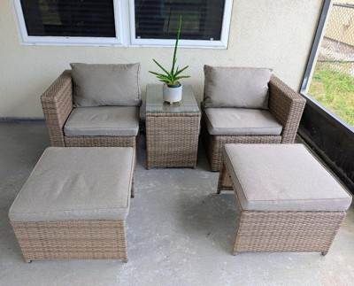 [This review was collected as part of a promotion.] Overall I am happy with the products. We have arranged them with the existing back deck furniture we have and it all goes together very nicely. I think this is good starter furniture for a patio. The cushions are not very thick so not very cushy but outdoor furniture does tend to be more stiff anyways. The quality of the wicker material seems very good. I will say we had quite a time assembling this furniture. Two of the parts were mislabeled so it took a while to figure that out and we had to be very loose with the assembly at first because where the holes are drilled is not perfectly aligned and not very forgiving. But now that they are assembled I think this is a good addition to our home. Everything does feel sturdy.