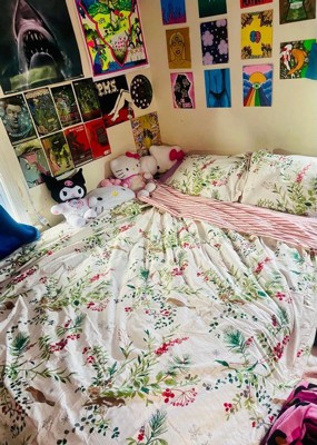 • A: The comforter set features an idyllic nature scene inspired by a classic holiday, including leafy branches, flowers, and songbirds.