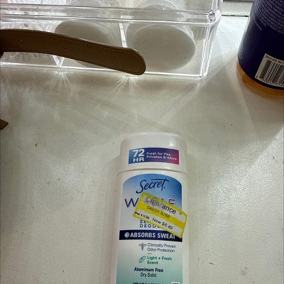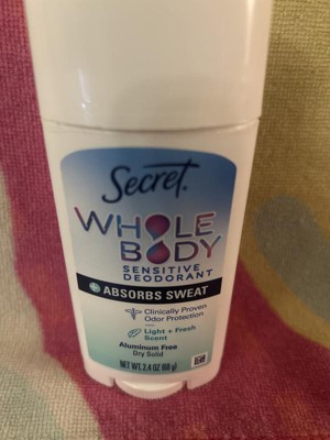 My review is for the Whole Body Sensitive Deodorant Stick Light & Fresh Aluminum Free Dry Solid. This product did not work for me at all. It did not provide 72hrs of fresh for pits, privates and more. There was no freshness or absorption from sweat. No directions on my stick of deodorant so I applied it right after showering and starting my day. Then I applied it before bed like Clinical Strength directions call for. Either way was ineffective. Secret has great products in my experience. This is not one of them. I would pass on this product.