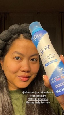 [This review was collected as part of a promotion.] It's so effective! Secret has always been and will always be my favorite deodorant brand. It helps me stay sweat-free and odor-free, even when I go to the gym or hiking. This one, specifically the Clinical version, works wonders for me. It has a fresh scent, doesn't irritate my skin, and the precision of the spray is the best!