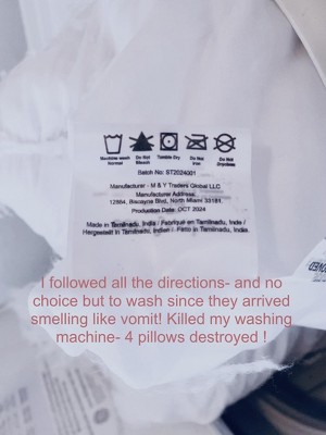 Comfy Cubs brand toddler pillows arrived smelling like vomit, I followed exact directions on the product and it destroyed four brand new pillows and killed my washing machine! Not to mention wasted time & energy with a lot of frustration-