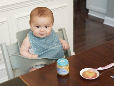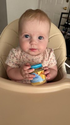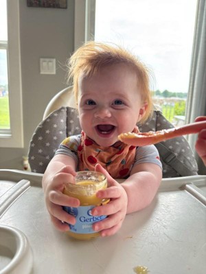 [This review was collected as part of a promotion.] My seven month old loves this food! The texture is smooth and something we don’t need to worry about her choking on. My husband and I love that the jars are reusable, unlike single use pouches.