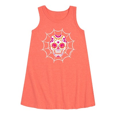 • A: The dress features a sleeveless, pull-on style with a keyhole neckline.