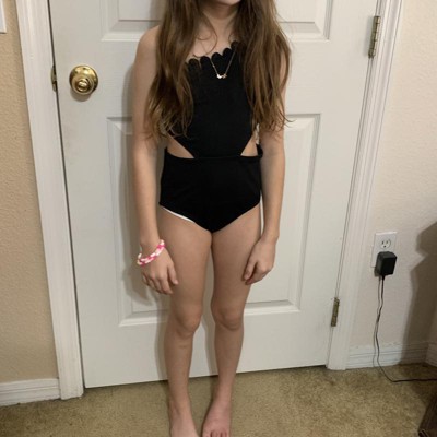 [This review was collected as part of a promotion.] My preteen daughter really loved this super cute swimsuit. It is in black, which is a classic color to be poolside and we love the scallop at the neck line and the cut outs to make it almost look like a two piece but it is a one piece bathing suit she typically wears a size 12. We ordered this in a 14 because sometimes with one pieces if we do the 12 it can be a little tight in the girth area so this fit her perfectly I received an incentive to write this review.