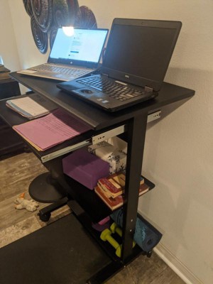 This desk is exactly what I was looking for. It's small enough I can tuck it in a corner, but big enough I can have my laptop and notebook on it, and the shelves hold my work supplies. I can easily wheel it out to work in front of a window, on the porch, or roll to another room when I need to take calls and meetings. It has been so nice to stand and move around, and not feel like I'm sitting crouched at my kitchen table all day.
