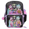 - Monster High 5 piece backpack set for girls: This backpack ghoulishly trendy backpack set is a must have for BACK TO SCHOOL. The set includes a 16-inch backpack with character print front zip pocket, lunch box, squish stress ball dangle, and water bottle