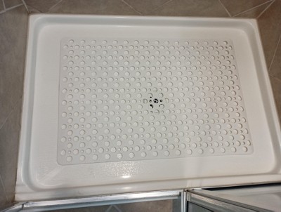 I finally found a shower mat that is big enough to fit my shower stall. This mat has a sturdy quality without being too heavy, and it feels nice under my feet. It has enough holes to drain the water, so water doesn't back up into the shower. The larger holes are also nice for hanging the mat to dry. I would definitely buy this mat again.