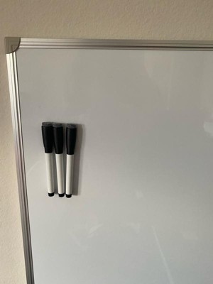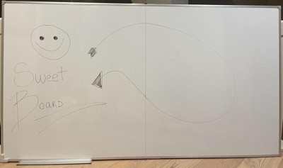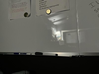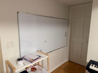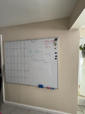 [This review was collected as part of a promotion.] This whiteboard writes incredibly smooth and erase is so easily making it a staple for every day life. It is extremely large, giving me plenty of space for creativity and organization; I use it for my calendar, grocery list, to-do list, and bills all in one spot. The kit included markers, magnets, eraser, and a snap-on tray and these accessories are so convenient! I especially love that the accessories are magnetized. It was easy to hang and is very durable, though it does not sit flush with the wall and sticks out slightly. When I write on it, it moves on & off the wall— almost like stool that has one leg unbalanced. Overall, it is high-quality and functional, it is perfect if you have lots of space and don’t mind its size.