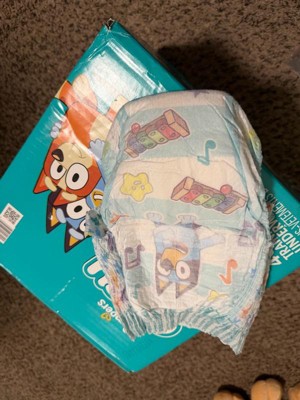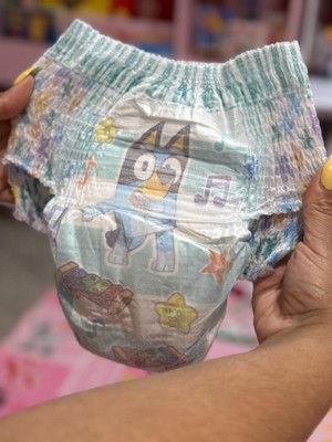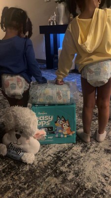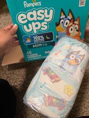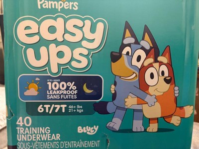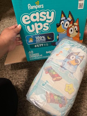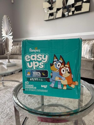 Ready to potty train with Bluey? Pampers Easy Ups Training Pants featuring Bluey makes it easy. They pair the feeling of real underwear with the protection of Pampers to make training easier for everyone. Give your child the confidence to take on potty training with a little more independence and a lot more fun. Easy Ups Training Pants feature stretchy sides and an underwear-like waistband for easy up and down, plus an ultra-absorbent core with LockAway Channel to help keep them dry day and night. With up to 2X better protection day and night*, Easy Ups deliver up to 100% leakproof protection. These hypoallergenic, dermatologist-approved training pants are made with 0% elemental chlorine, parabens, or latex** and backed by the Pampers Safety Promise. Fun Bluey designs motivate your toddler to potty train. Pampers Easy Ups are also available with Peppa Pig! Pair with Pampers Sensitive Wipes to help keep your toddler's skin healthy. Find your toddler's best fit in the following sizes: training pants 2T-3T (diaper size 4,15-34 lbs.), training pants 3T-4T (diaper size 5, 20-40 lbs.), training pants 4T-5T (diaper size 6, 23-50 lbs.), training pants 5T-6T (diaper size 7, 35-60 lbs.), training pants 6T-7T (diaper size 8, 46+ lbs.)