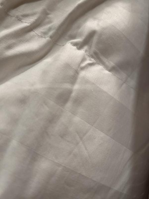 Deliciously, cozy, comforter, warm and perfectly sized. I am used to down comforters having a somewhat crunchy feel but this one is soft and cozy and I feel is all season. It is not too heavy for summer and I don’t think it’s going to be too light this winter either. Very well made, and I’ve had no problems with quills poking through