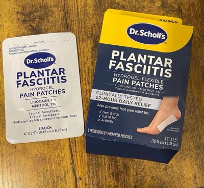 Dr. Scholl’s® Plantar Fasciitis Pain Patches with Hydrogel Technology provide clinically tested 12-hour daily relief from pain caused by plantar fasciitis using maximum strength lidocaine without a prescription, plus cooling menthol. These hydrogel-flexible pain patches contour to your foot for comfortable wear and relief. Have other foot pain? These pain patches will also provide relief from heel & arch pain, ball of foot pain, and foot pain due to arthritis. Why It Works: Lidocaine used topically provides a local anesthetic effect that blocks pain signals created by the pain receptors. Menthol is a counter irritant that has been shown to work through a cooling effect to desensitize the pain receptors and in doing so reduce pain perception and provide pain relief.