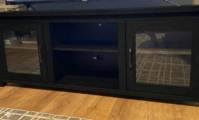 This traditional black wash TV stand is designed to hold TVs up to 80 inches. Crafted from tempered glass and engineered wood, this TV stand elegantly combines the two to bring warmth and style to any space in your home.