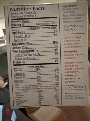 This is useful to have on hand if you have kids so long as they are not allergic to its ingredients. It uses colostrum from cows and egg solids and is flavored with vanilla and sucralose. It’s a powder that mixes with water. You get 3 packets per box and even though it can resolve issues with one dose, you may end up using the full box within the first day.