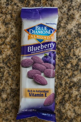 The Blue Diamond oven-roasted almonds with blueberry flavor are a robust and refreshing snack for those on the go. The 1.5 Oz package fits perfectly in your pocket or slip it into your purse. For the price, the blueberry flavored almonds are a great addition to a meal or perfect portion for a quick snack to curb hunger.