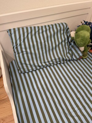 • A: Hello n - Thank you for your interest on - Toddler Striped Kids' Cotton Sheet Set Blue/Green. This three-piece bedding set includes one fitted sheet, one flat sheet, and a matching pillowcase. Hope this helps. - Rose