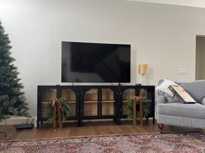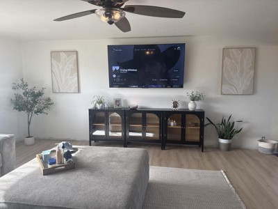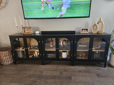 This was a perfect addition to our family room. Beautiful black and tan media center. Love the shape of the glass doors. The touch of gold accent handles and hinges is just what I needed.