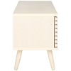 Lend a sleek and modern update to your home with our charming Averi media stand. Our chic and clean-lined media stand impresses with its functional design and elevated details. The storage unit is perched upon tapered legs to easily complement your modern or contemporary home. A reeded wood detail creates a stunning slatted surface to add chic patterns and texture. Showcasing a white wash finish, our media stand lends sleek style and practicality to any room. Its open shelves and two roomy cabinets offer plenty of space for electronics, media essentials, and decor.