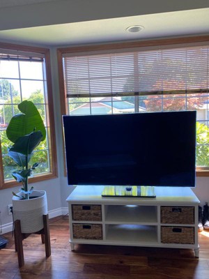 This is a great tv stand and is a very cute staple piece of our bedroom. It was well packaged and arrived safely without a scratch. It came mostly assembled, I just needed to attach the legs. It’s a very sturdy material and the baskets are solid. I love the cute baskets for tucking away books and decor, and the shelves in the middle are great for setting up a console.