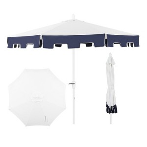 • The two-tone design features solid white canvas with a square-scalloped edge in navy with white piping; white aluminum pole