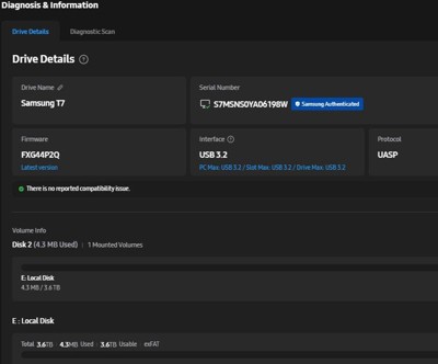 Unlike the 1TB and 2TB T7 models Samsung Magician software does not support the Secure Erase function on the 4TB T7 model.