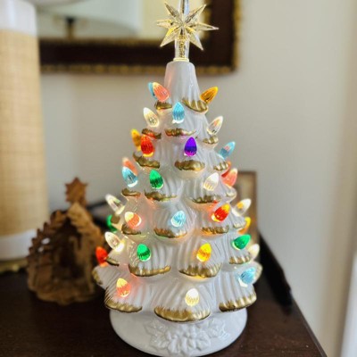 Casafield Hand Painted Ceramic Christmas Tree, Green 12-Inch Pre-Lit Tree with 100 Multi Color Lights and 2 Star Toppers