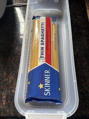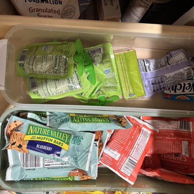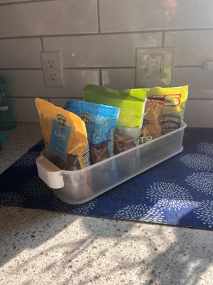 This organization bin fits anything! I love the flex handles and the long shape. Can fit granola bars to spaghetti and more! I need about 3 more for my pantry. Great find and buy! Must have for any room. Could even fit cosmetics and bathroom essentials,