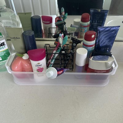 This is a shallow slim storage bin from Brightroom. Great for keeping essentials organized in the bathroom. Since it is slim in size, it will fit in a smaller space. I really like that it is stackable. It is sturdy and durable. Easy to pick up with the handles on each end. Can be used anywhere storage is needed.