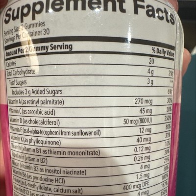 I bought these for my 14 y/o daughter as I take the women’s plus version and love them. I purchased and didn’t have my glasses to read, there’s no iron in these. I know it’s important for teenage girls to either intake iron by diet or vitamins due to menstruation cycles. Then as I continue to read the label, I noticed a misprint. Vitamin D is fat soluble, which means it stores in your fat cells versus water soluble goes through kidneys and into urine if your body has enough. The vitamin D content is much much more than 500IU as stated on the label. If these vitamins truly contain 50mcg Vitamin D, that’s equivalent to 2000 IU. Teenagers can take this amount but it is ideal for less than this, especially since it stores in fat cells. In general, be informed and asked questions before giving your child any vitamins. AND my teen said these taste gross. They’re going in the trash.