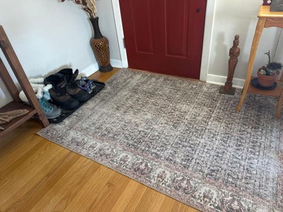 [This review was collected as part of a promotion.] I replaced an all grey rug and it made a big difference in the appearance in my front room. I have a grey marbled colored lounger and loveseat along with a dusty pink chair and cherry colored wood floors. Even though the color description says peach it still goes very well with all the furniture. After I received it I bought a smaller version of the same rug to go under my dining table. I really love the way they look.
