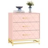 - This chest of drawers with a simple design The pink finish, gold handles, and then adding concave and convex lines to the simple engineered wood panel, are perfect for multiple occasions like office, bedroom, and kitchen. Not only can be used as a clothing organizer/lingerie dresser, but also can be an accent storage cabinet for living room. It can easily match any interior style!