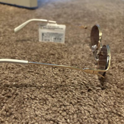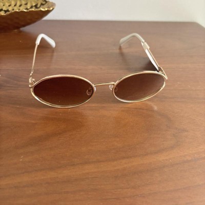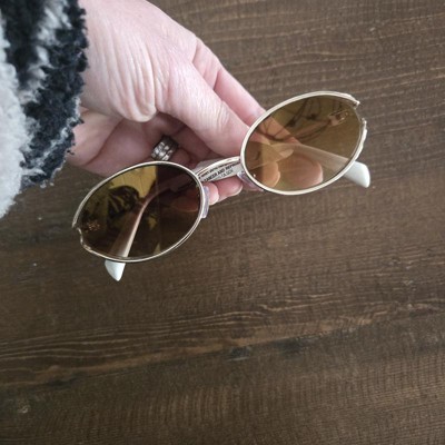 Sport a fashionable look during dates, casual outings, and beyond with the Oval Open Frame Metal Sunglasses from A New Day™. These gold-tone sunglasses feature an oval shape with an open frame and white temples for a gorgeous look. Designed with a metal frame, these oval sunglasses have maximum UV protection feature lenses to help keep your eyes shielded from the sun's rays. Complete with nose pads, these metal-frame sunglasses fit medium faces.