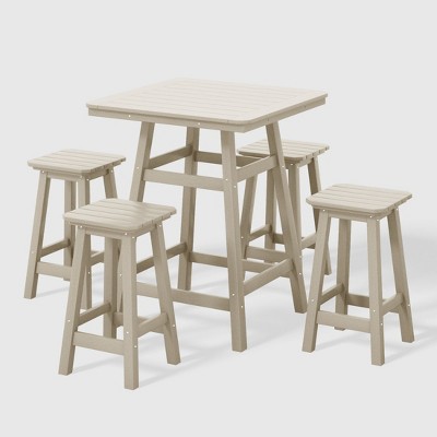 • All Weather, UV-resistant, and Durable HDPE Polyethylene Construction. Smooth-Edged Design Prioritizes Safety for All Sizes. Resistant to Sun Exposure, Snow, Rain, Mold, & Wet Rot. The Table Features a Pedestal Design. The Stool Features a Four (4) Leg Design Ensures Unrivaled Stability.