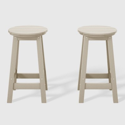 This 24" counter-height round-seat bar stool presents a sophisticated addition to your outdoor patio, ideally suited for placement around your outdoor patio bar or bistro table. crafted from durable and recycled HDPE material, its design is tailored for outdoor use, boasting UV and weather-resistant properties that safeguard the stool. Available in a palette of fade-resistant solid colors ensures the enduring vibrancy of its charming color each season. backless design makes for seamless storage underneath the table, offering both versatility and elegance. classic yet modern aesthetic effortlessly harmonizes with your existing decor, while the A-frame design, supported by four sturdy square legs and foot bars, provides a well-balanced and comfortable seating experience.