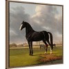 The image features a majestic black horse standing prominently in the foreground on a patch of earth beside a calmly flowing stream. In the background, a serene rural setting unfolds with other horses grazing in green fields surrounded by wooden fences. The scene is set under a sky with large, billowy clouds, suggesting a tranquil yet powerful nature. Trees and a church are faintly visible in the distance, enhancing the pastoral ambiance of the artwork. This canvas art print was created by Anthony Oberman and printed in Waunakee, WI. It is stretched across a solid surface to resist sagging. We use only premium, high-tension canvas. Our exclusive stretching techniques hide corner folds and provide a taut canvas surface. The artwork is authentically licensed. The canvas appears as if it is floating in the frame because it has a narrow gap between the edge of the canvas and the frame. Our canvas items are individually made using traditional custom framing techniques, it has the quality you would expect from your local frame shop.
