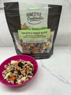 [This review was collected as part of a promotion.] My dog loved the fresh pet homestyle creations, chicken, and turkey recipe so much that he dug right in, especially going for the sweet potato and carrot pieces which I was surprised. The texture looks fresh and soft and not overly processed in my dog. Finished his bowl without hesitation.. He sometimes a picky eater, but he gobbled to this right up no problem.