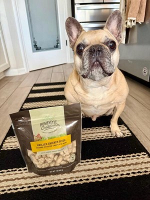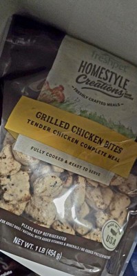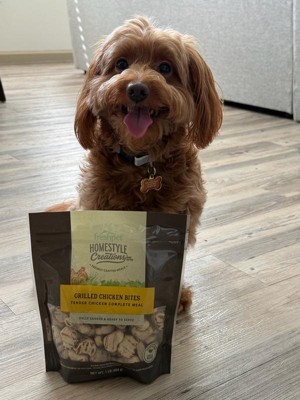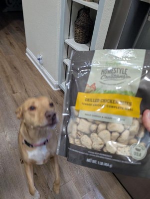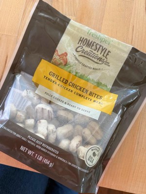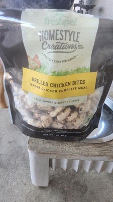 [This review was collected as part of a promotion.] Homestyle creations FreshPet grilled chicken bites are made with fresh chicken and veggies, giving that home cooked feel. My dogs loved it and didn’t have any reactions like an upset stomach. It smells fresh, my kids saw the bag in the fridge and had to double check the label, they thought it was for them! It does have a short shelf life after being opened so keep that in mind. Overall I recommend.