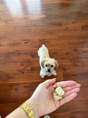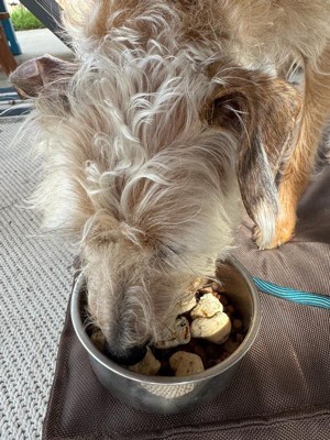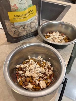 [This review was collected as part of a promotion.] Our dogs were very excited to try the grilled chicken in their everyday dog food. I crushed up four-five pieces in each bowl. These boys tend to throw up everything they eat that isn’t their typical dog food. (One dog has his wet with water or broth for his breed type issues). They get too excited with new stuff that it’s so hard to watch them eat because they scarf it down fast. They did good with this really soft, seasonally fragrant grilled chicken bites and DID NOT get sick in the house yesterday from scarfing down! I’m calling it a win for yesterday. The bag says to use within 7 days of opening, and these guys are small and will not be able to finish this whole bag by then (everything in moderation and we are strict about going them too much too often because animals gets bratty and spoiled and even difficult). I will potentially try to separate and freeze these into weekly portions for use in Sunday dinner and midweek dinner for them. This would be more worth it, for me with small dogs, in maybe 4 sealed pouches within this bag to reduce waste although it would unfortunately increase plastic waste. I will most likely buy these again and again!