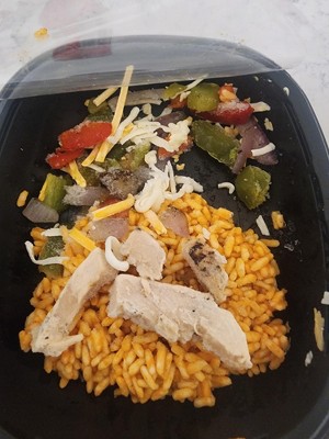 cooked rice (water, rice), flour tortillas (enriched bleached flour [flour, niacin, reduced iron, thiamine mononitrate, riboflavin, folic acid], water, vegetable shortening [interesterified and hydrogenated soybean oils], contains 2% or less of: salt, baking soda, sodium acid pyrophosphate, distilled monoglycerides enzymes, cellulose gum, fumaric acid, and calcium propionate and sorbic acid [to maintain freshness], cooked seasoned chicken white meat strips (chicken white meat, water, less than 2% soy sauce [water, soybeans, salt, and alcohol], rice starch, salt, natural flavors, spices, flavor [yeast extract, citrus extract]), green and red bell pepper strips onion ground tomatoes in puree (tomatoes, citric acid), water canola oil cheddar cheese (pasteurized cultured milk, salt, enzymes, annatto [vegetable color]), monterey jack cheese (pasteurized milk, cheese cultures, salt, enzymes), contains less than 2% guajillo chili pepper base (water, guajillo chili, onion puree, sea salt, cane sugar, spices [mustard], cilantro, garlic puree, sesame seeds paprika, corn starch, citric acid), chicken base (cooked mechanically separated chicken, salt, chicken flavor, maltodextrin, chicken fat, sugar, whey powder [milk], onion powder, extractives of turmeric [color], natural flavor), salt, paprika [color], corn starch, butter, spices, dehydrated garlic, flavor (contains maltodextrin).