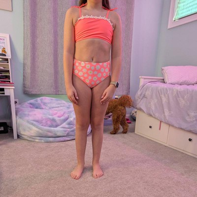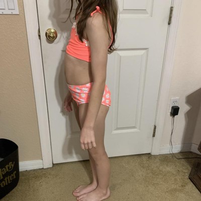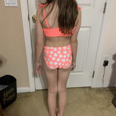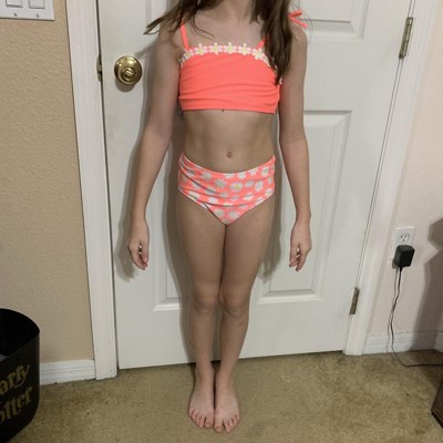 [This review was collected as part of a promotion.] This size Small Girls Floral Printed Two Piece Bikini fits my daughter perfectly. The bottoms feature a repetitive floral print on a vibrant coral color. The top is a vibrant coral color with dainty embroidered flowers lining the top aspect. The straps have non functional ties for style. The price is affordable and standard for a quality swim suit. Overall, love this suit. I received an incentive to write this review.