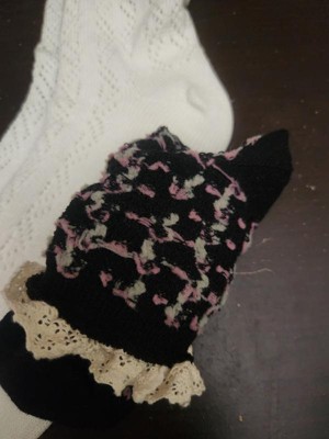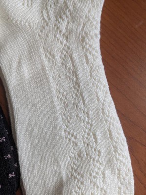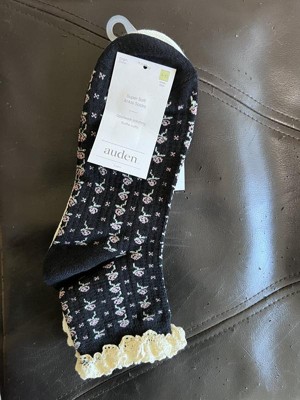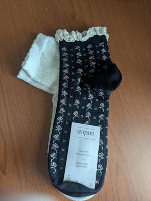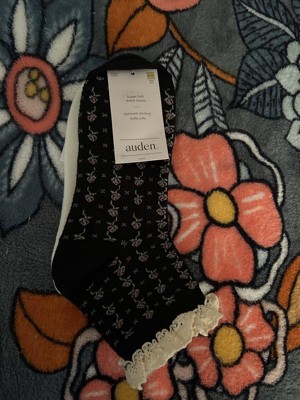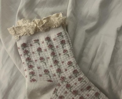 A: The socks feature floral lace, pointelle details, rib cuffs, and ruffle trim for added style.