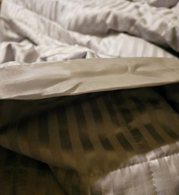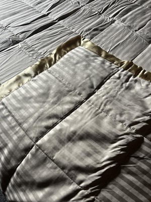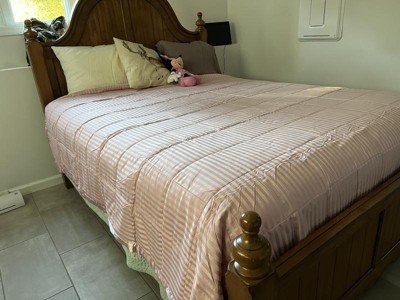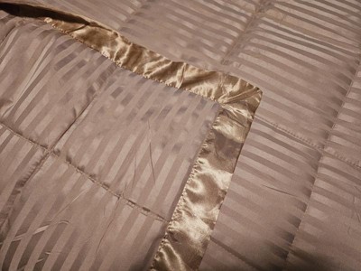 I really love this blanket! Not only is it pretty, it feels great also! The stripes with the satin trim remind me of the comforter in a nice hotel that I have stayed at. My husband is always hot at night and this blanket has been perfect as it doesn’t make him sweat but it is warm enough for me because I’m always cold. I’m definitely going to purchase another one for my guest room!