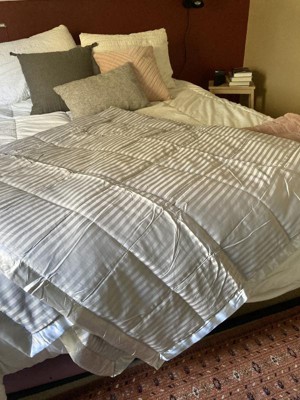 I love this comforter; it's stylish and soft. The stripes and satin trim give it a "luxe" look. I live in Florida, and this blanket is a nice weight for fall and winter here. For really cold weather, you'll want an additional blanket underneath.
